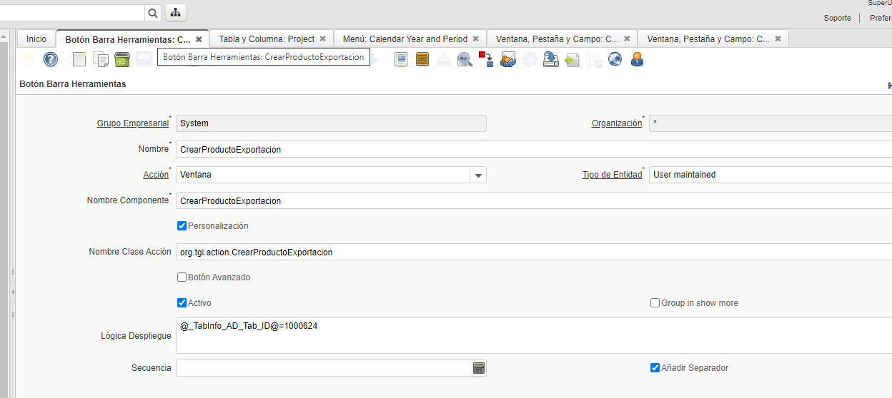 proceso para crear productos en una exportacion, tomando codigo de ventana año calendario periodo