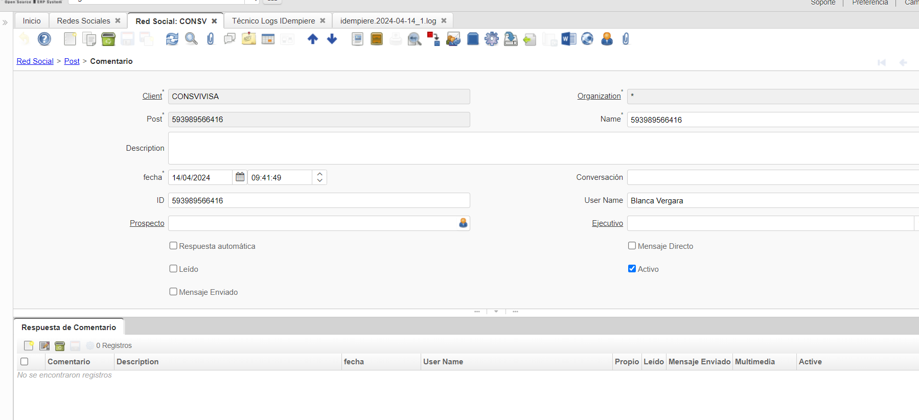 openerror al grabar mensajes, por nuevo campo warehouse que no existe. No se asignan a los ejecutivos