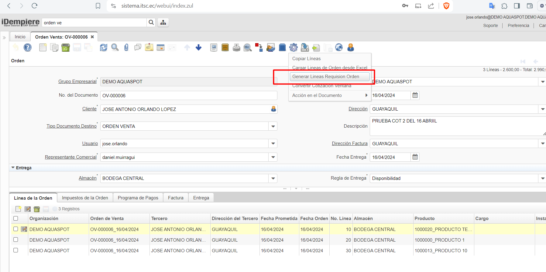 crear req desde orden venta