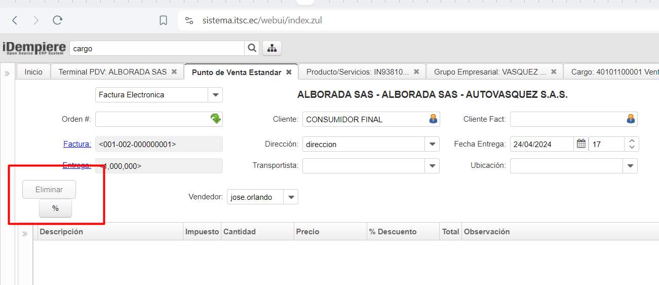 openrevisar punto de venta estandar, botones de eliminar y %, que se ubiquen bien en la forma
