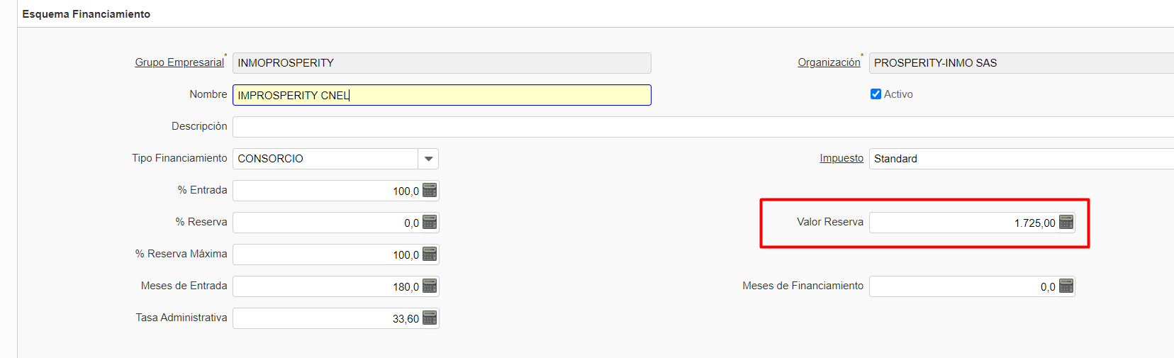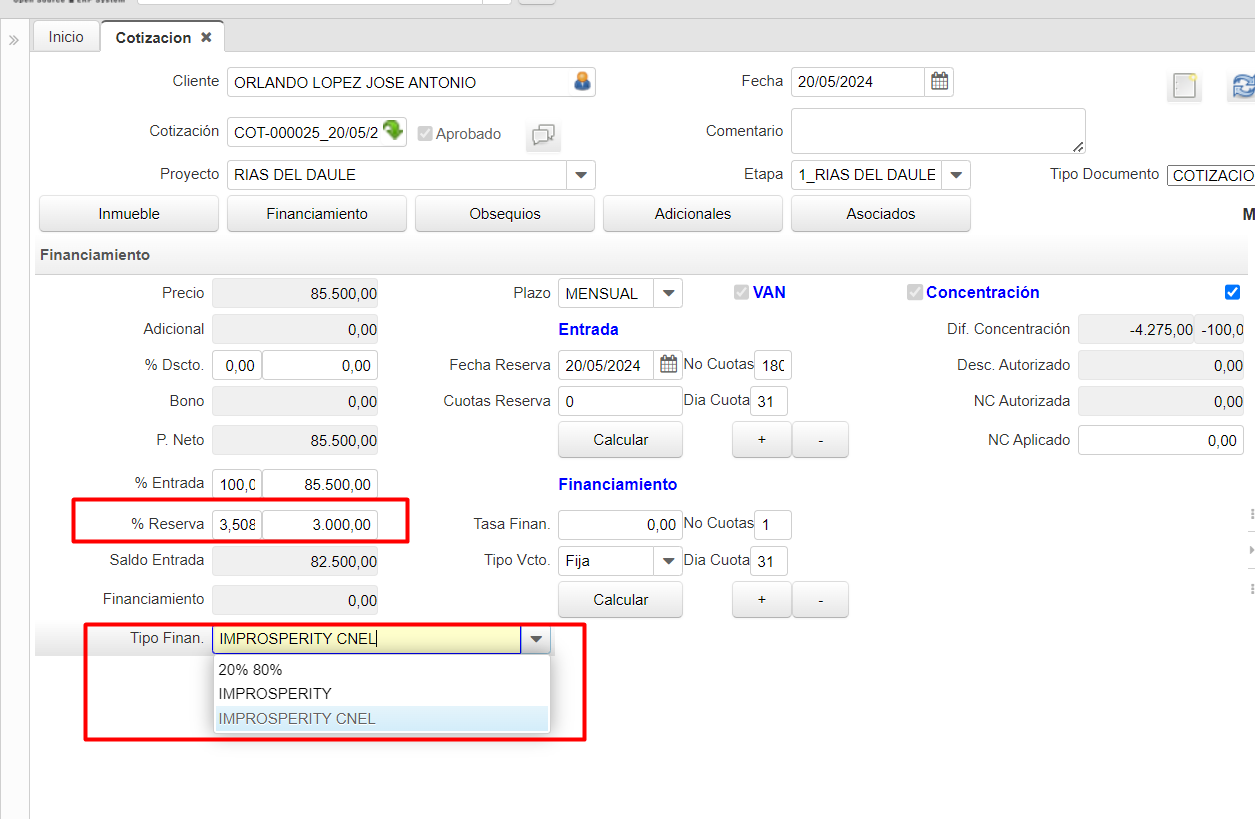 openforma cotizar, al cambiar el esquema de financiamiento, no cambia el valor de la reserva