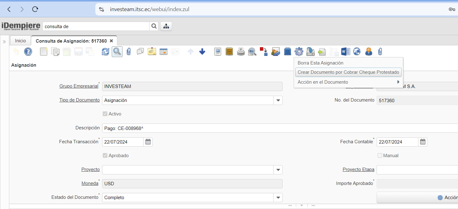 openproceso Protestar Cheque, es similar a proceso que esta en consulta de asignacion