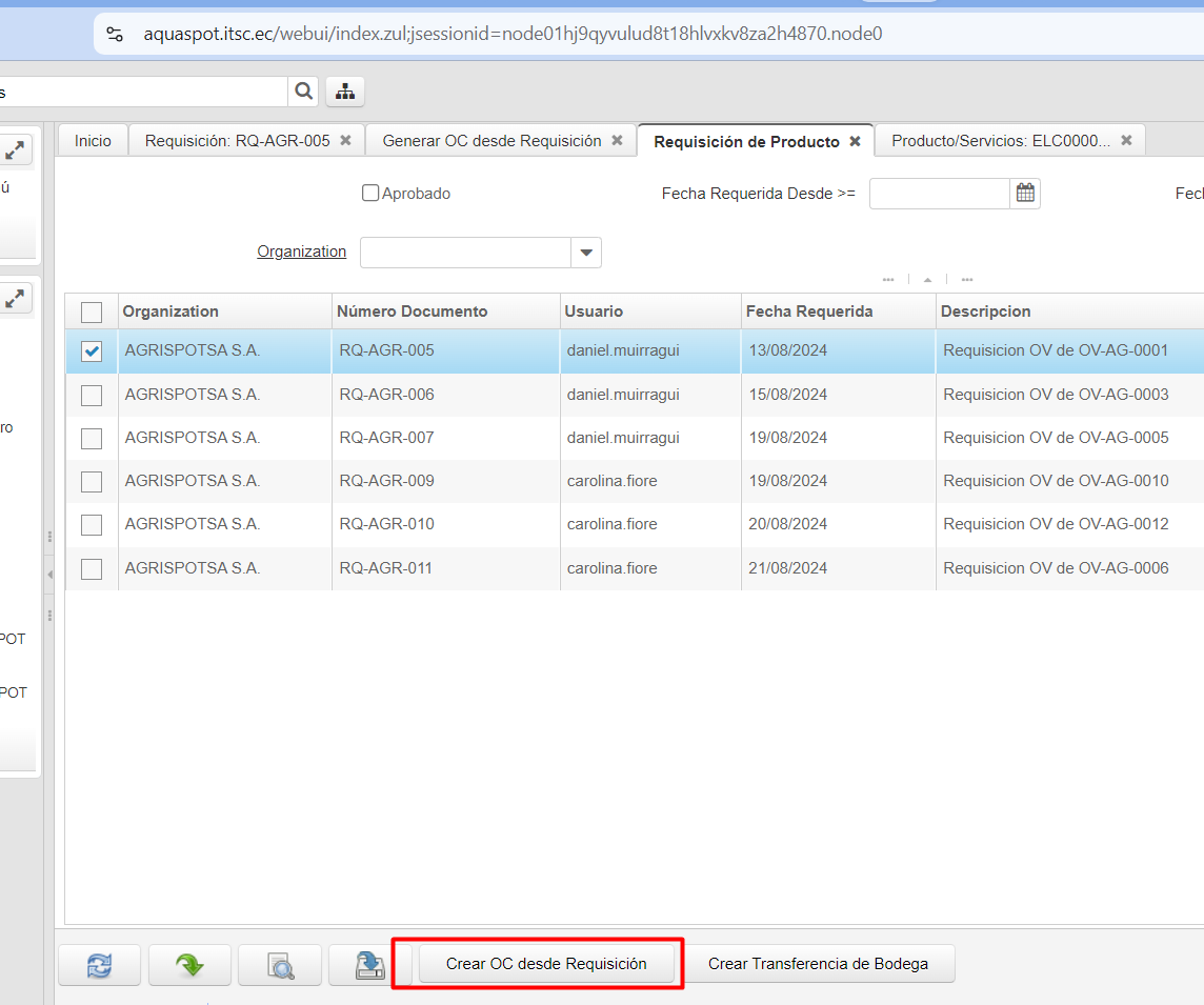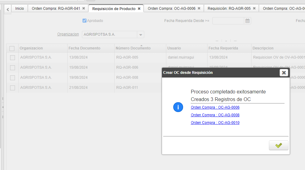 openproceso crear oc desde requisición