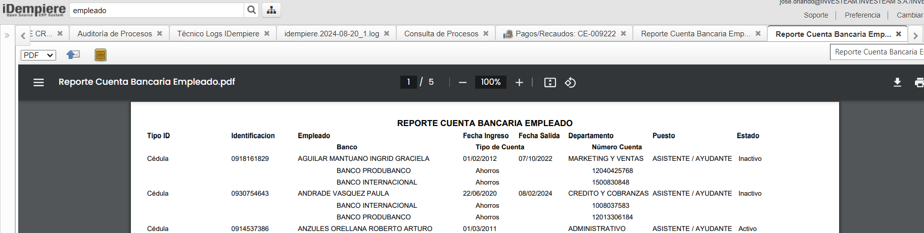 openreporte de cuentas bancarias de empleados