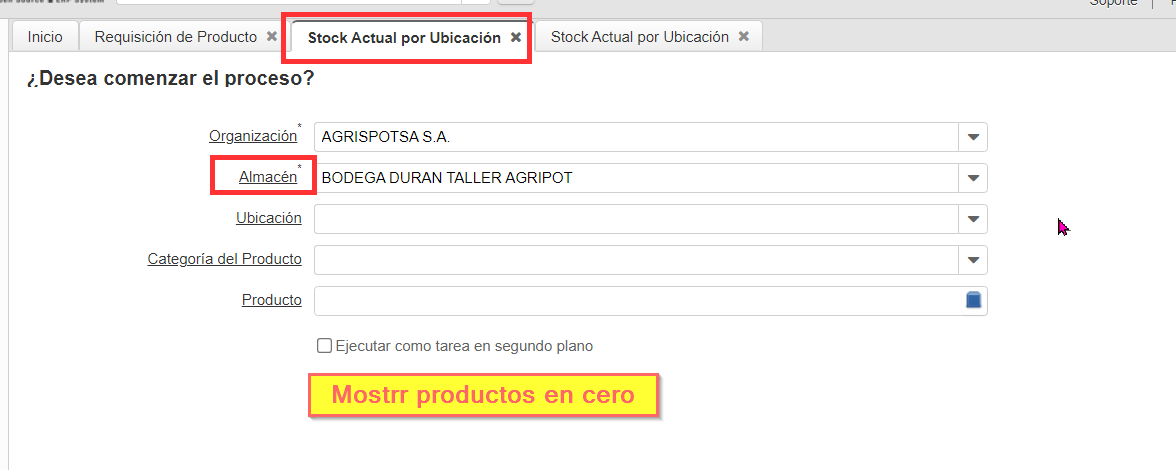 EL REPORTE ESTÁ OBLIGANDO A SELECCIONAR SÓLO UN ALMACÉN, Y DEBERÍA PERMITIR ESCOGER EN AASTERISCO PARA QUE ME REPORTE TODOS LOS ALMACENES AL MISMO TIEMPO. DENTRO DE CADA ALMACEN LOS PRODUCTOS AGRUPADOS SEGÚN SUS UBICACIONES (SI ES QUE HAY UBICACIONES DIFERENTES POR ALMACEN). EL PROCESO DEL REPORTE DEBERÍA MOSTRAR SÓLO PRODUCTOS CON SALDO DE STOCK, LOS QUE ESTÁN EN "CERO" NO SE DEBEN MOSTRAR, A MENOS QUE SE ACTIVE UNA OPCIÓN (CHECK) AFUERA PARA PERMITIR MOSTRAR CANTIDAD EN CERO (FAVOR PONER ESTE CHECK)