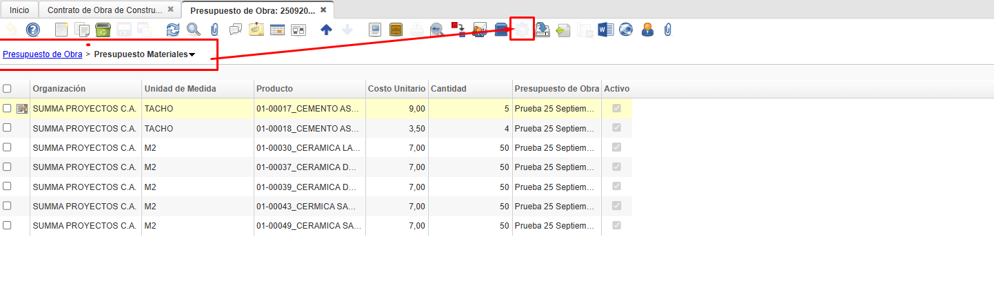 Crear el proceso de copiar los materiales de la linea del presupuesto en presupuesto de materiales al contrato de obra cliente en la pestaña