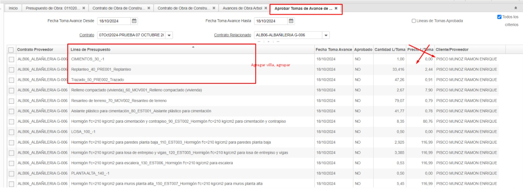 Quitar columna precio, agregar columna % avance acumulado, % avance actual