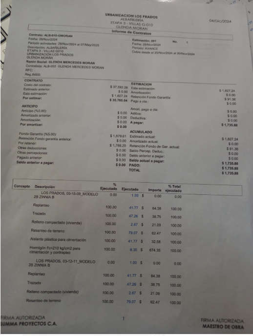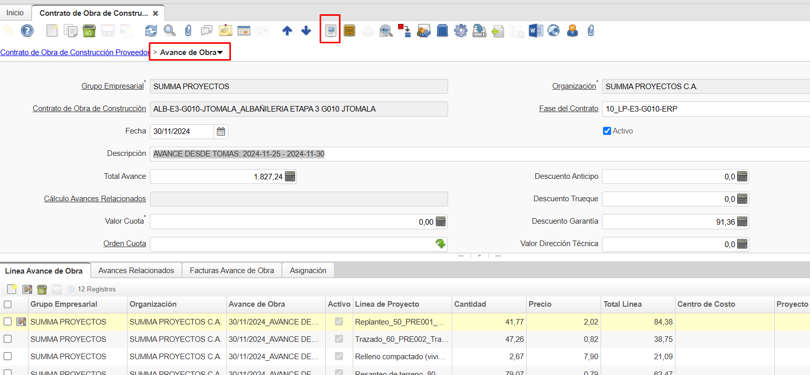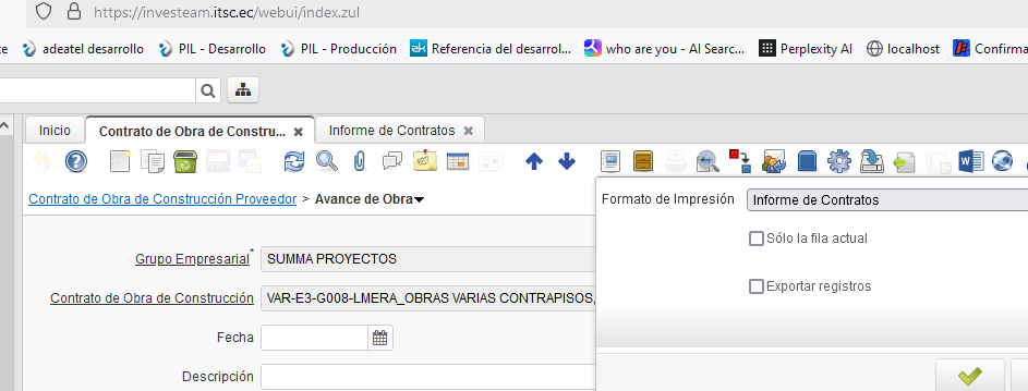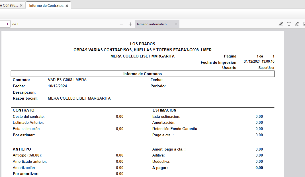 en la ventana contrato de obra de construccion Proveedores, en la pestaƱa avance de obra en informes realizar el reporte