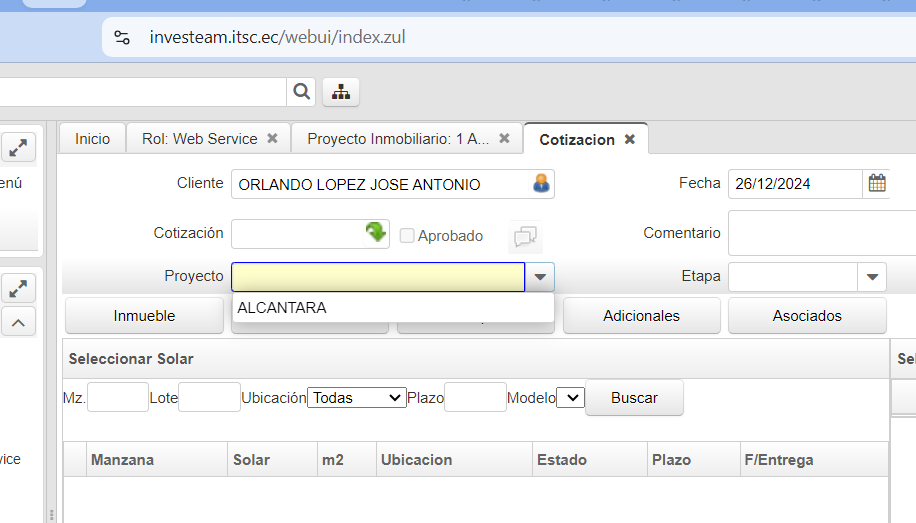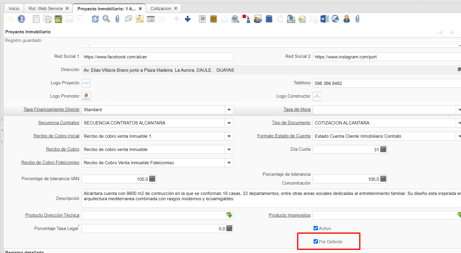 openproyecto inmobiliario por default al cotizar