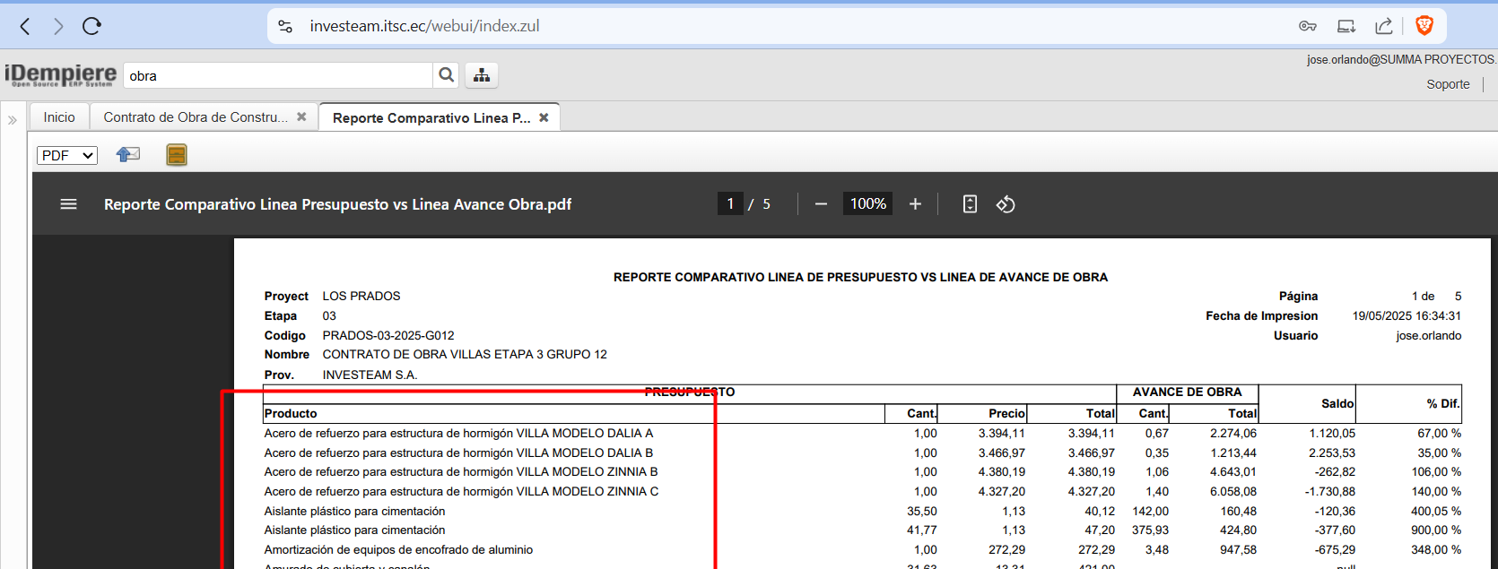 openNuevo Reporte Comparativo Presupuesto vs Real Contrato de Obra