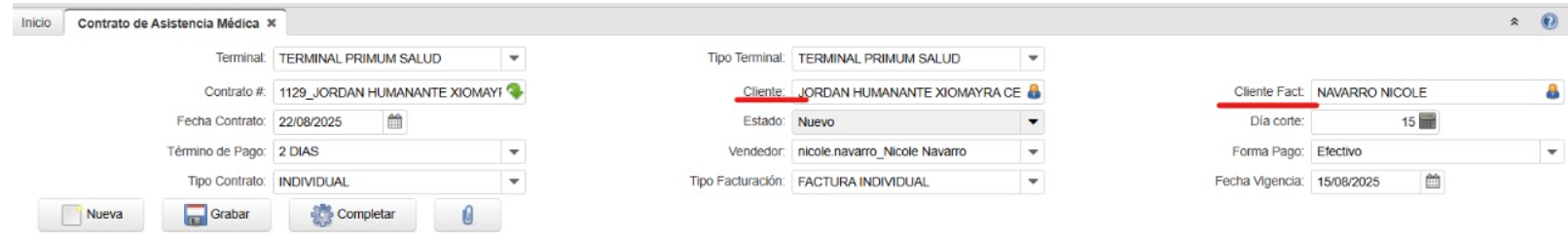 1. En la opción de ingreso al cliente deberá indicar la palabra TITULAR y en cliente factura debe decir CONTRATANTE PAGADOR