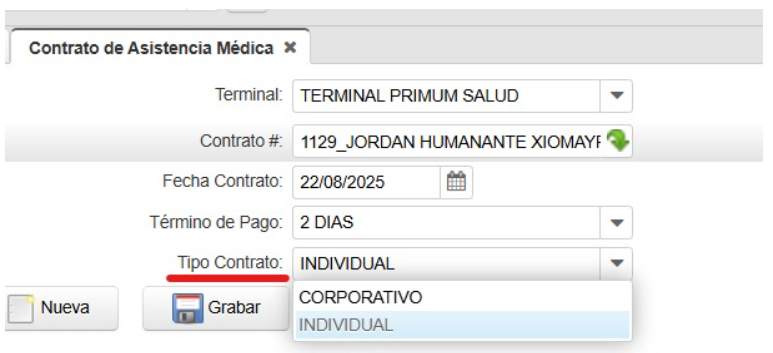 2. En la opción tipo de contrato debería estar parametrizado solo con el nombre INDIVIDUAL y no debe permitir escoger otra opción (solo lectura)