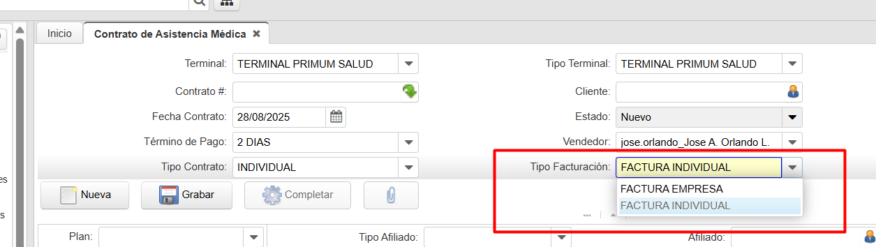 3. En la opción tipo de factura debería estar parametrizado solo con el nombre INDIVIDUAL y no debe permitir escoger otra opción (solo lectura)