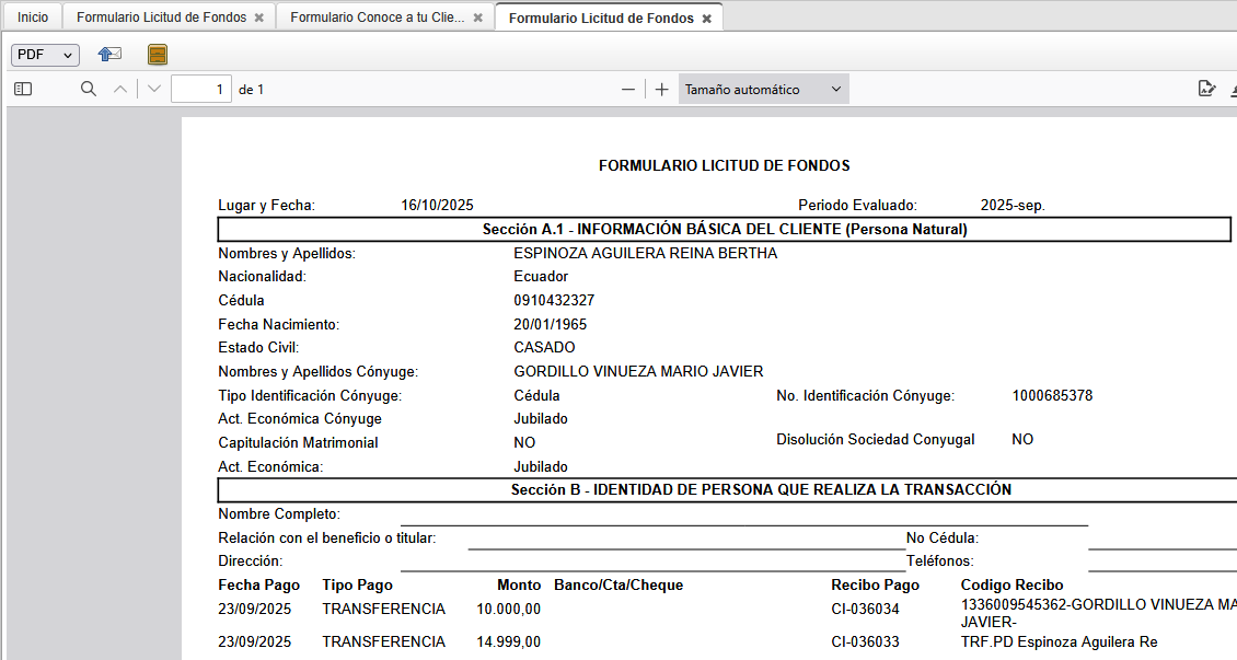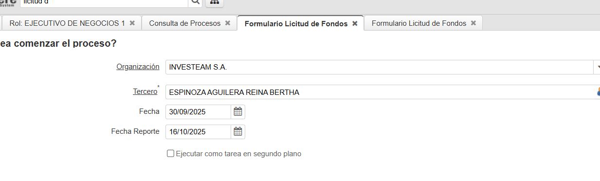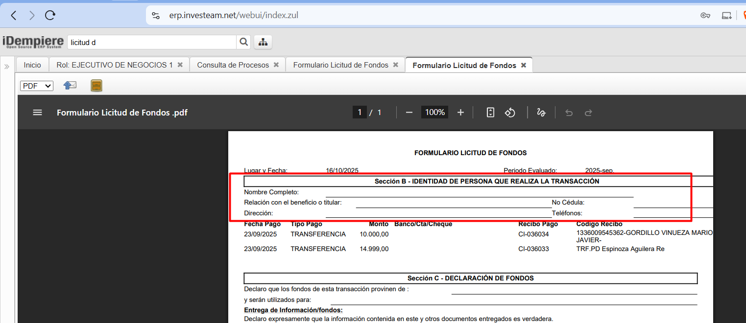 formulario licitud de fondos, no sale cliente